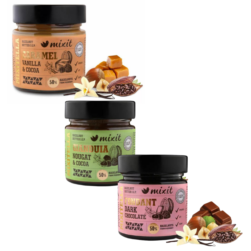 Mixitella Premium zawiera wyłącznie orzechy laskowe pochodzące z malowniczego regionu Langhe w sercu Piemontu. Te orzechy laskowe posiadają prestiżowy znak I.G.P. (Indication of Geographic Protection), co oznacza, że są niezwykle wyjątkowe i cenne. Nasz krem wzbogaciliśmy o wysokiej jakości kakao w proszku, naturalny cukier trzcinowy oraz ekstrakt waniliowy, aby dostarczyć Ci niezapomniany smak. Znak I.G.P. potwierdza, że każdy orzech laskowy użyty w naszej Mixitelli został zebrany z pasją i starannością w górzystym regionie Langhe, uważanym przez ekspertów i smakoszy za miejsce, z którego pochodzą najlepsze orzechy laskowe na świecie. Teraz możesz cieszyć się wyjątkowym smakiem Piemontu w każdej łyżeczce naszego kremu.