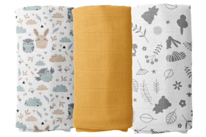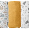 Zestaw zawiera 3 pieluszki muślinowe w rozmiarze 60x80cm (+/-3cm) – dwie we wzorki, jedna kolorowa.