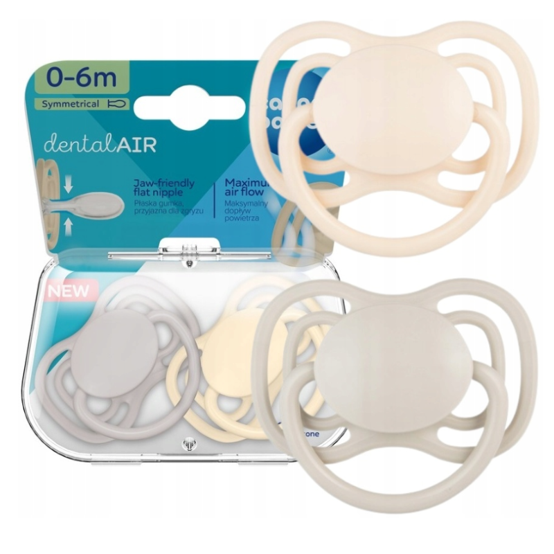 - Symetryczna gumka: Płaska i delikatna dla zgryzu, łatwo dopasowuje się do buzi dziecka, niezależnie od sposobu umieszczenia.