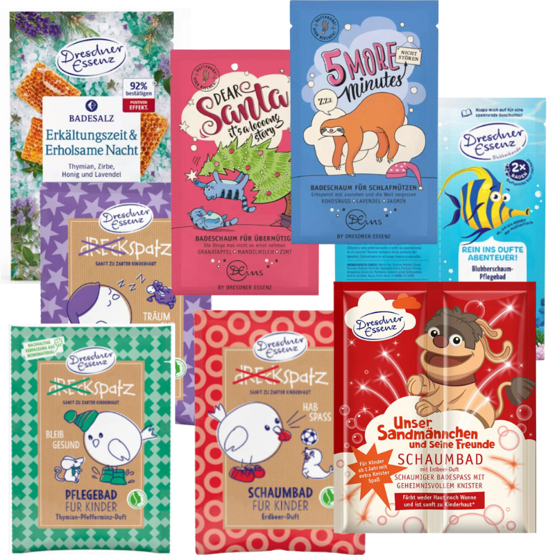 Z wachlarza produktów do kąpieli wypróbuj nasz bestseller, dając swojemu Dziecku najlepszą opiekę i ulgę w przypadku kataru i zatkanego noska dzięki „Soli do kąpieli Bądź zdrów!” marki Dresdner Essenz.